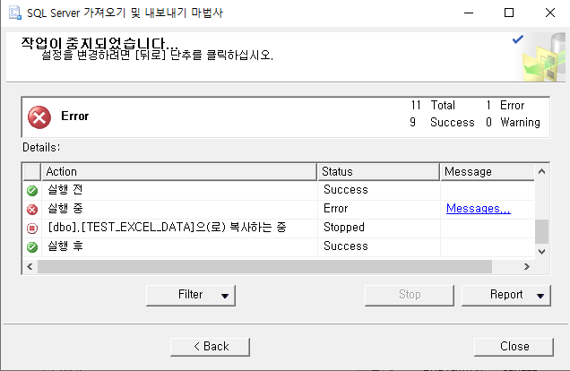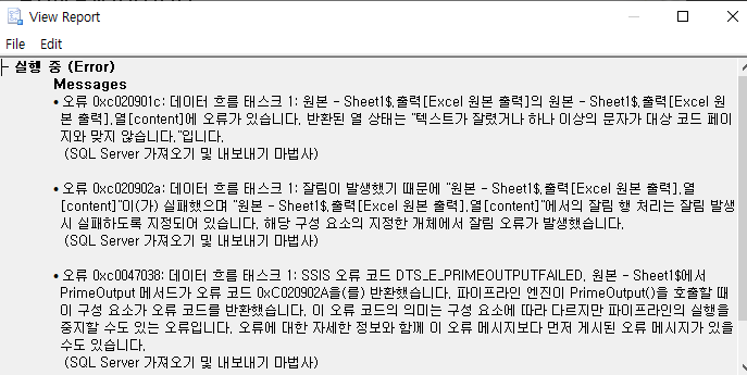 ![]() ½ÇÇà Áß (Error) Messages ¿À·ù 0xc020901c: µ¥ÀÌÅÍ È帧 ŽºÅ© 1: ¿øº» - Sheet1$.Ãâ·Â[Excel ¿øº» Ãâ·Â]ÀÇ ¿øº» - Sheet1$.Ãâ·Â[Excel ¿øº» Ãâ·Â].¿[content]¿¡ ¿À·ù°¡ ÀÖ½À´Ï´Ù. ¹ÝȯµÈ ¿ »óÅ´ "ÅØ½ºÆ®°¡ À߷Ȱųª Çϳª ÀÌ»óÀÇ ¹®ÀÚ°¡ ´ë»ó ÄÚµå ÆäÀÌÁö¿Í ¸ÂÁö ¾Ê½À´Ï´Ù."ÀÔ´Ï´Ù. (SQL Server °¡Á®¿À±â ¹× ³»º¸³»±â ¸¶¹ý»ç) ¿À·ù 0xc020902a: µ¥ÀÌÅÍ È帧 ŽºÅ© 1: À߸²ÀÌ ¹ß»ýÇ߱⠶§¹®¿¡ "¿øº» - Sheet1$.Ãâ·Â[Excel ¿øº» Ãâ·Â].¿[content]"ÀÌ(°¡) ½ÇÆÐÇßÀ¸¸ç "¿øº» - Sheet1$.Ãâ·Â[Excel ¿øº» Ãâ·Â].¿[content]"¿¡¼ÀÇ À߸² Çà 󸮴 À߸² ¹ß»ý ½Ã ½ÇÆÐÇϵµ·Ï ÁöÁ¤µÇ¾î ÀÖ½À´Ï´Ù. ÇØ´ç ±¸¼º ¿ä¼ÒÀÇ ÁöÁ¤ÇÑ °³Ã¼¿¡¼ À߸² ¿À·ù°¡ ¹ß»ýÇß½À´Ï´Ù. (SQL Server °¡Á®¿À±â ¹× ³»º¸³»±â ¸¶¹ý»ç) ¿À·ù 0xc0047038: µ¥ÀÌÅÍ È帧 ŽºÅ© 1: SSIS ¿À·ù ÄÚµå DTS_E_PRIMEOUTPUTFAILED. ¿øº» - Sheet1$¿¡¼ PrimeOutput ¸Þ¼µå°¡ ¿À·ù ÄÚµå 0xC020902AÀ»(¸¦) ¹ÝȯÇß½À´Ï´Ù. ÆÄÀÌÇÁ¶óÀÎ ¿£ÁøÀÌ PrimeOutput()À» È£ÃâÇÒ ¶§ ÀÌ ±¸¼º ¿ä¼Ò°¡ ¿À·ù Äڵ带 ¹ÝȯÇß½À´Ï´Ù. ÀÌ ¿À·ù ÄÚµåÀÇ Àǹ̴ ±¸¼º ¿ä¼Ò¿¡ µû¶ó ´Ù¸£Áö¸¸ ÆÄÀÌÇÁ¶óÀÎÀÇ ½ÇÇàÀ» ÁßÁöÇÒ ¼öµµ ÀÖ´Â ¿À·ùÀÔ´Ï´Ù. ¿À·ù¿¡ ´ëÇÑ ÀÚ¼¼ÇÑ Á¤º¸¿Í ÇÔ²² ÀÌ ¿À·ù ¸Þ½ÃÁöº¸´Ù ¸ÕÀú °Ô½ÃµÈ ¿À·ù ¸Þ½ÃÁö°¡ ÀÖÀ» ¼öµµ ÀÖ½À´Ï´Ù. (SQL Server °¡Á®¿À±â ¹× ³»º¸³»±â ¸¶¹ý»ç) ÇØ°á¹æ¾È1½ÇÇàÀåÀ» ÄѰí(window + r) regedit ¸¦ ÀÔ·ÂÇÏ¿© ·¹Áö½ºÆ®¸® ÆíÁýâÀ» ¿¬´Ù.